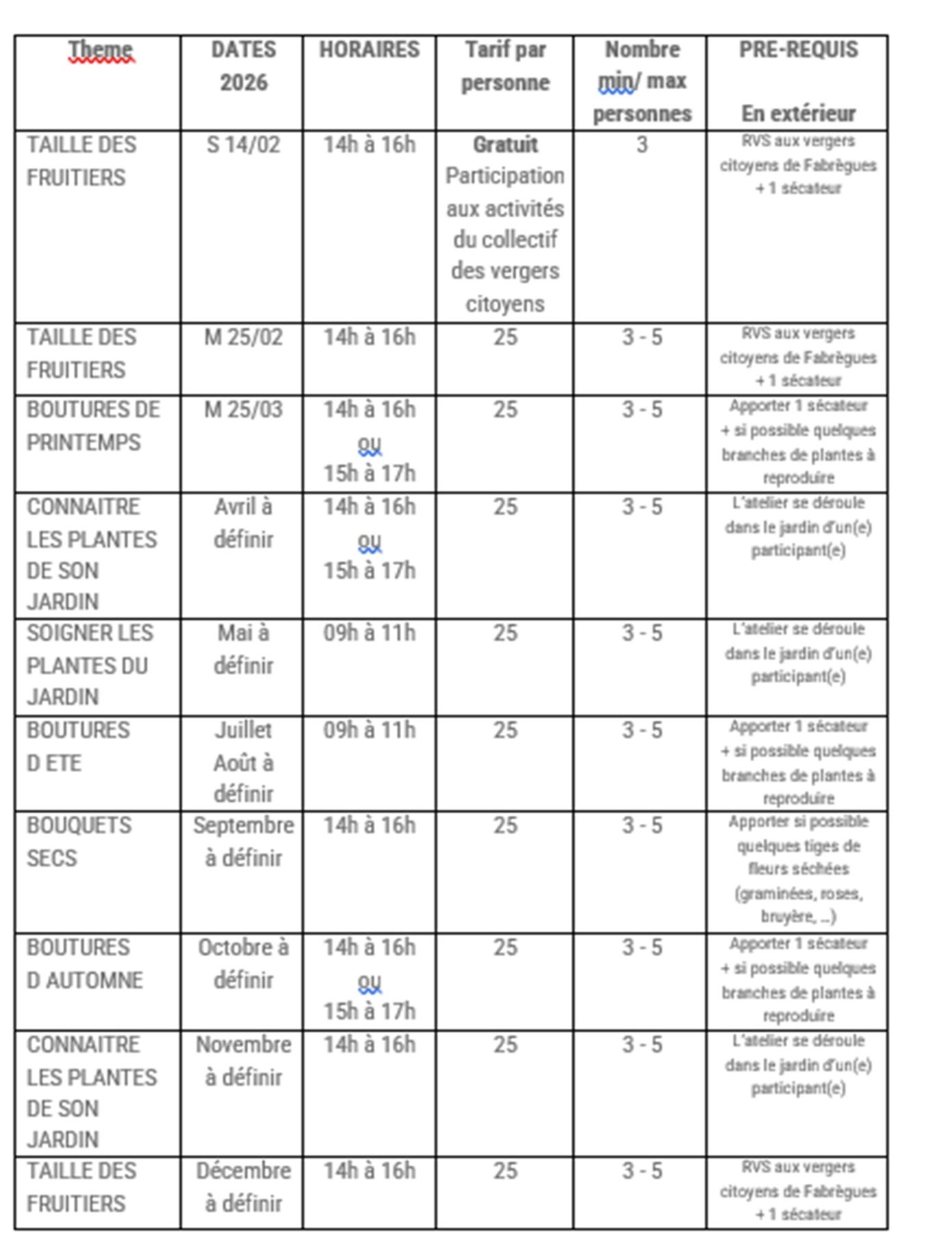 Calendrier des ateliers 2026